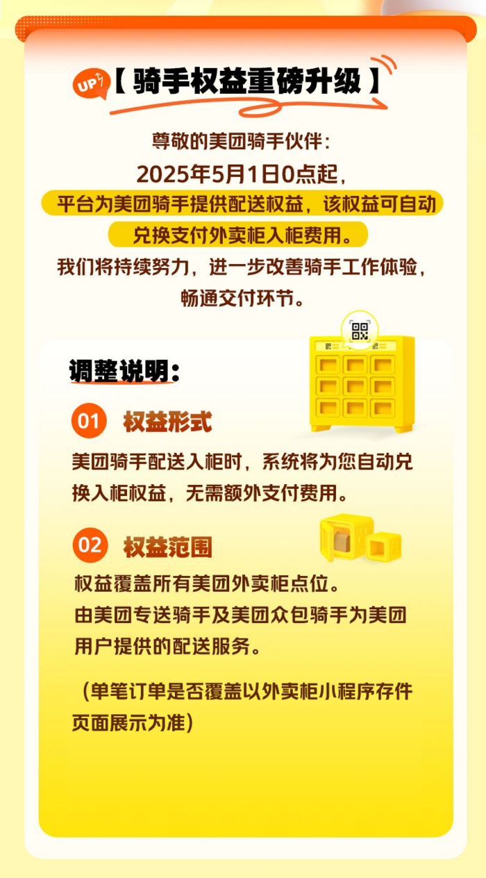 美团宣布自2025年5月1日起,全面免除骑手使用外卖智能柜的费用,覆盖所有美团专送及众包骑手,系统将自动兑换入柜权益,无需额外支付。平台强调骑手需按用户要求配送(送货上门或入柜),禁止未经允许私自使用外卖柜。若权益未生效,需通过重启App或重新扫码解决。