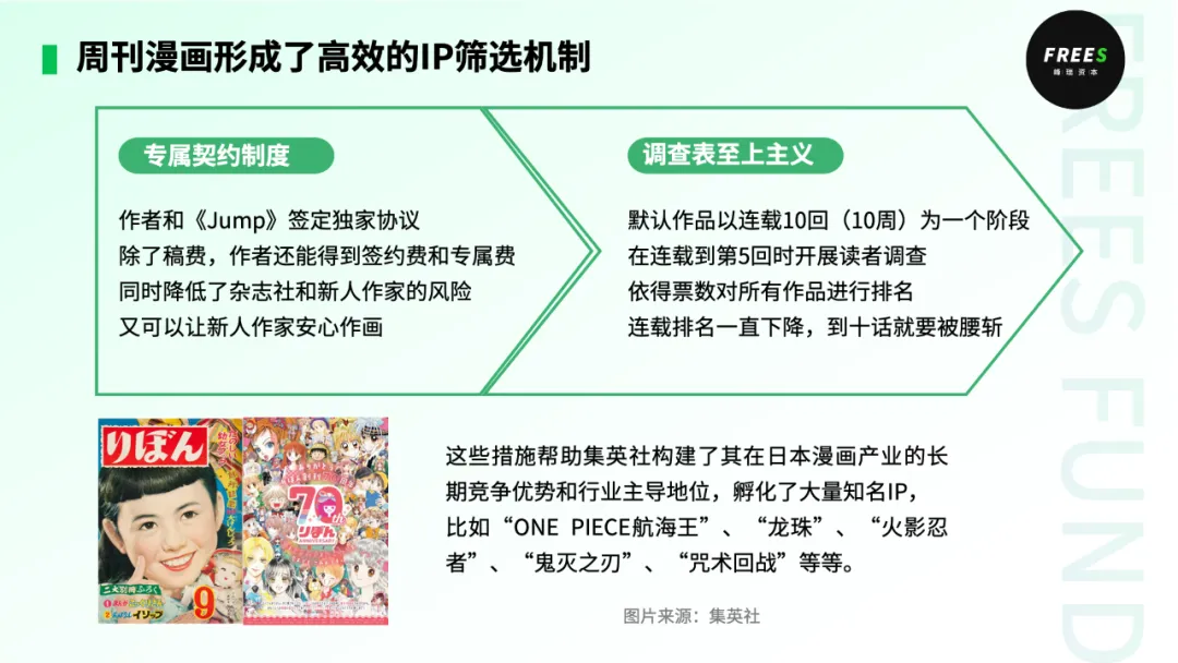 周刊漫画开创了日本现代漫画的商业运作模式,形成了高效的筛选机制,助推日本IP产业进入到原创独立IP阶段。
