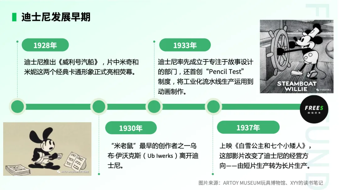1930年,“米老鼠”最早的创作者之一乌布·伊沃克斯(Ub Iwerks)离开迪士尼。迪士尼意识到,依靠单个作者的创意是不可持续的,于是率先将工业化流水线生产运用到动画制作。