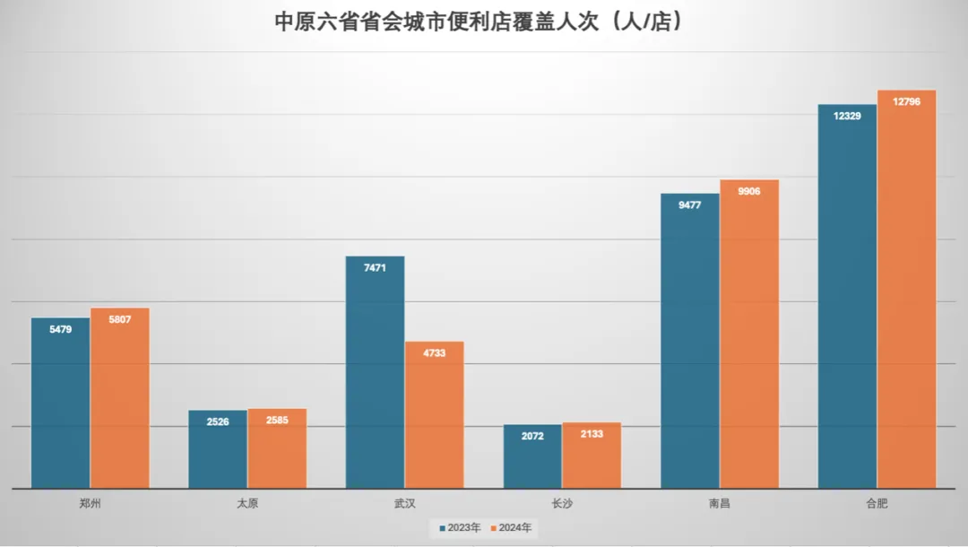 另外统计2023和2024年的变化值,在中部六省的省会城市中,仅有武汉的连锁便利店覆盖密度在增加(2024年为4733人/店、较2023年减少2738人/店),而郑州是覆盖密度减少第三高的城市(2024年为5807人/店,较2023年增加328人/店),也是仅优于南昌和合肥。