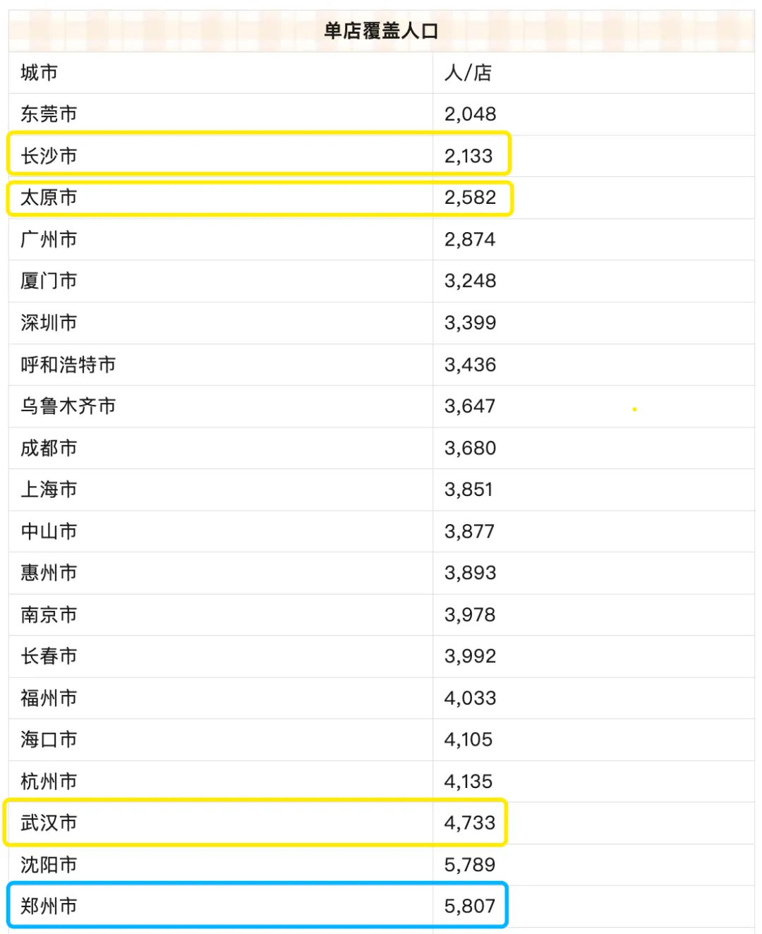 值得注意的是,单店覆盖人次在4000以下的14座统计城市中并没有郑州,而与郑州距离相近的山西太原市,便利店人均覆盖数为2585人/店,位列全国第三。