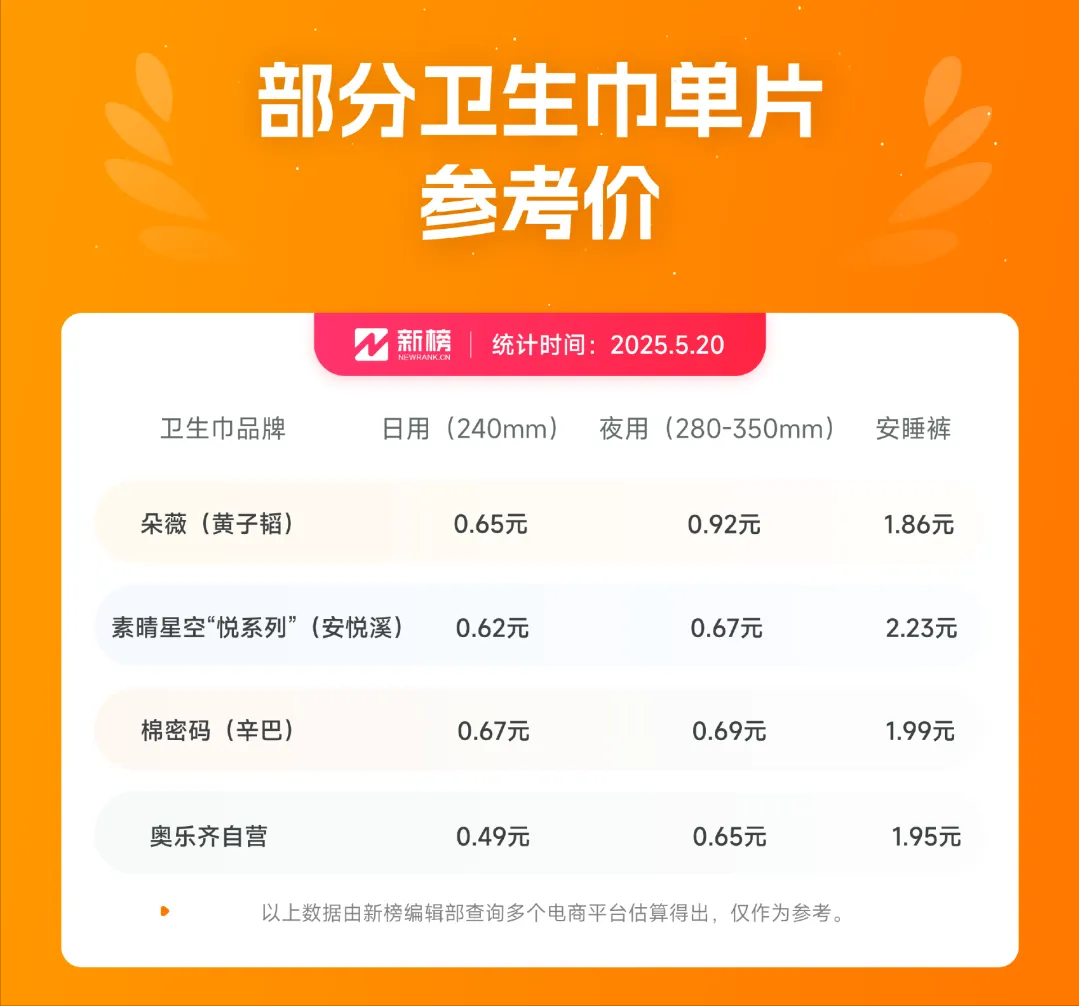 新榜编辑部以网红主播自研卫生巾、连锁商超自营品牌卫生巾为统计对象,分别大致估算了不同尺寸规格卫生巾单片价格。