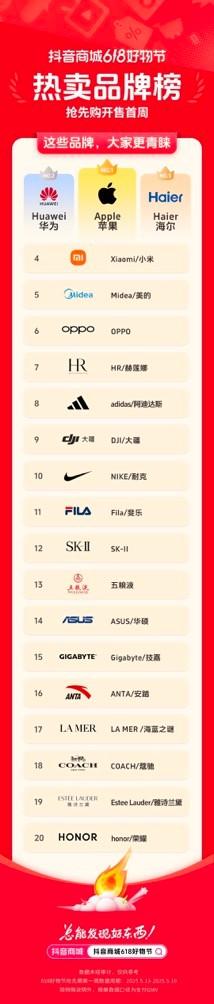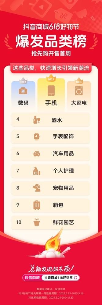 1. 抖音电商618首周榜单显示,手机、数码、大家电是增速最快品类,受益于国补和平台双重补贴政策