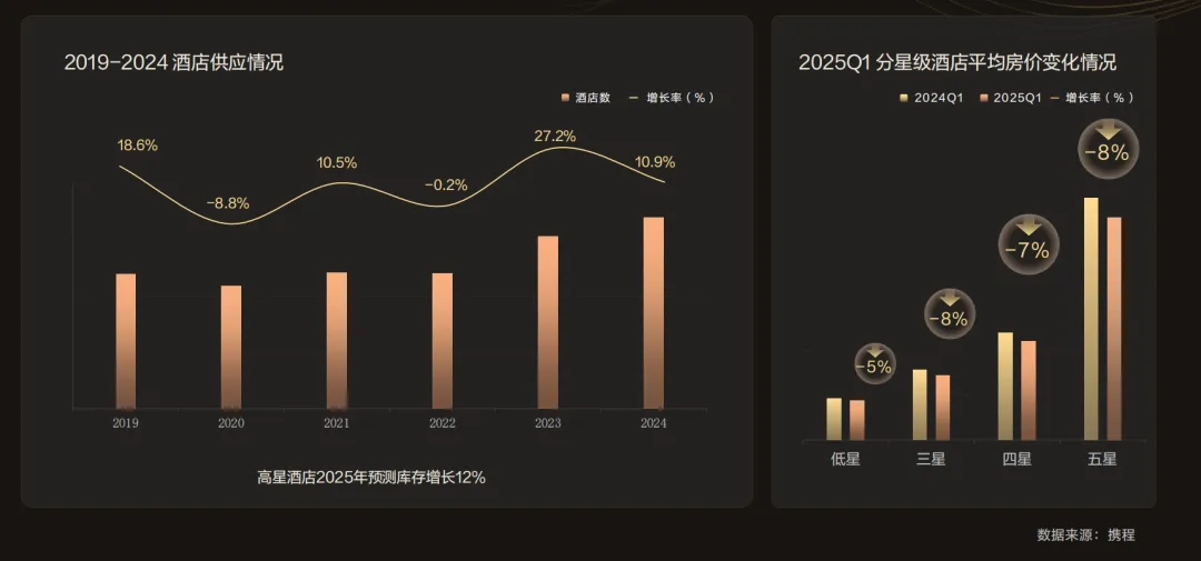 同时我们也注意到,2023年和2024年这两年酒店数量增长的很快,预计2025年高星级酒店也会保持12%左右的增长。侧面反应,实际上国内酒店供给是非常充足的,某种程度上可能已经过剩。