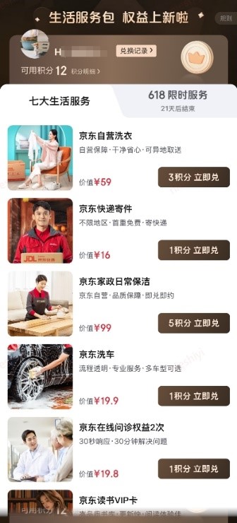 今年年初,京东PLUS会员全面升级,新增“生活服务包”,每个PLUS用户年卡效期内享有12个基础积分,用积分可免费兑换“生活服务包”里的家政、洗衣洗鞋、洗车、问诊等即时服务,享受更多便利和实惠。今年京东618大促期间,京东对于新开卡的用户推出积分翻倍福利,额外再送12积分,相当于新会员直接获得24积分,可兑换价值超过480元的服务,额外赠送的积分兑换有效期截止日期为6月20日。