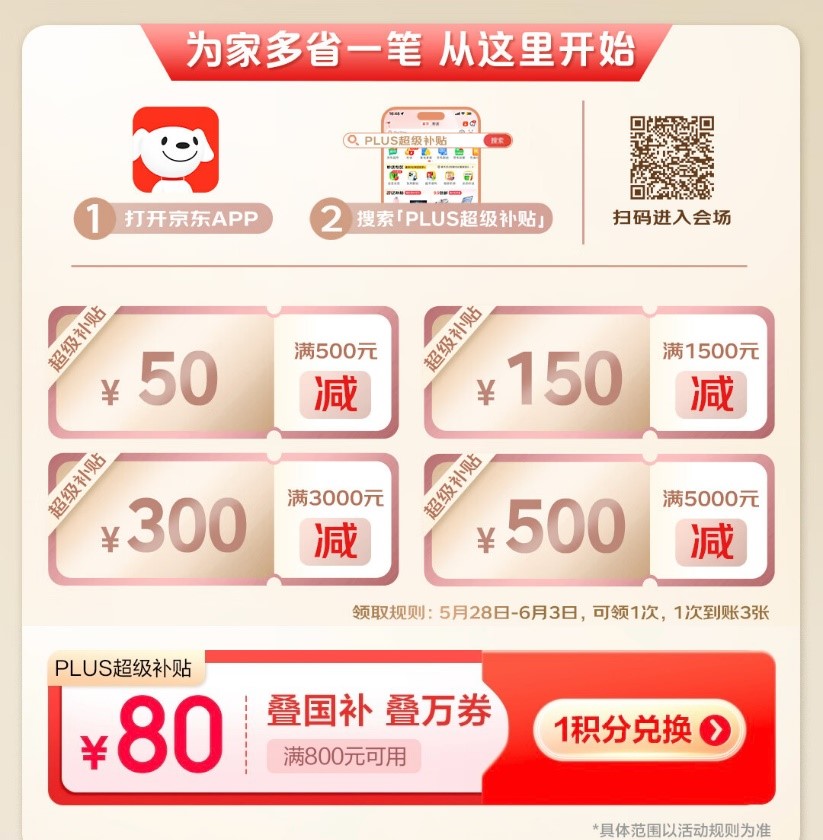 划重点,京东PLUS会员专享的“PLUS超级补贴”大额优惠券来了,无论是家电、3C数码、服饰还是美妆等品类,都能以更低价格买到心仪商品。5月28日0点至6月3日24点,京东PLUS超级补贴券向PLUS会员开放领取,即领即用,包括满5000元减500元、满3000元减300元、满1500元减150元、满500元减50元等不同额度、总面值1000元的优惠券,每位PLUS用户在领券期间可领1次,每个额度优惠券到账3张,总优惠金额达3000元。值得关注的是,5月30日晚8点将全新上线满800减80全品类惊喜券,每日10点可用积分限量抢购兑换,还能叠加国家补贴、平台其他优惠券使用,让PLUS会员体验超值购物特权。