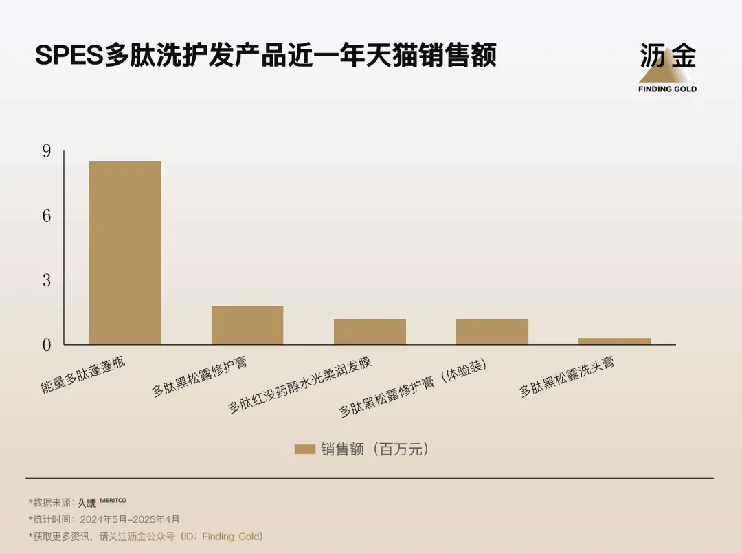 同样主打抗衰功效的还有多肽。诗裴丝SPES从去年下半年开始,推出了一系列主打多肽成分的头皮洗护单品,取得了不错的销售成绩,天猫渠道销售超过千万,其中黑松露相关的单品,销售总额超过了3百万。