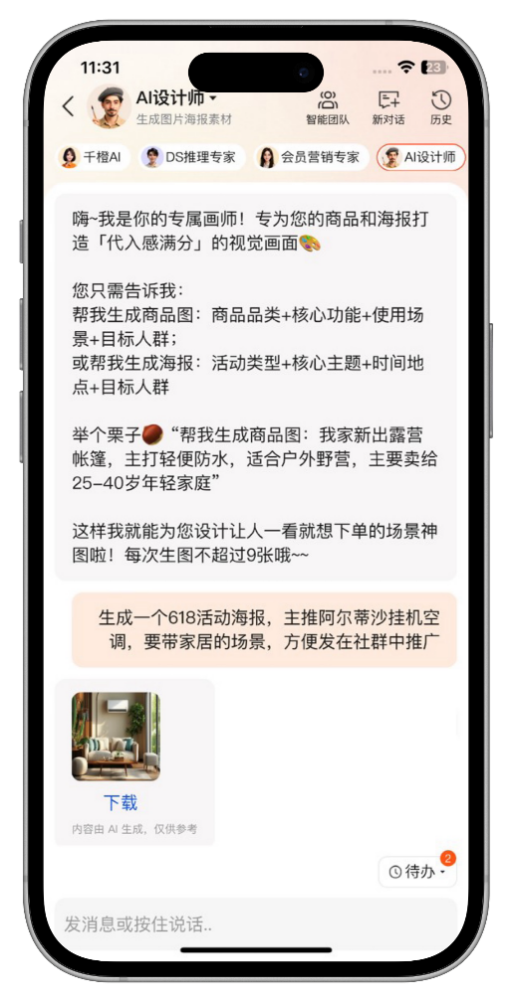 1. 品牌推广:通过AI生成多媒体素材提升传播效率,如社群海报及视频内容一键输出。