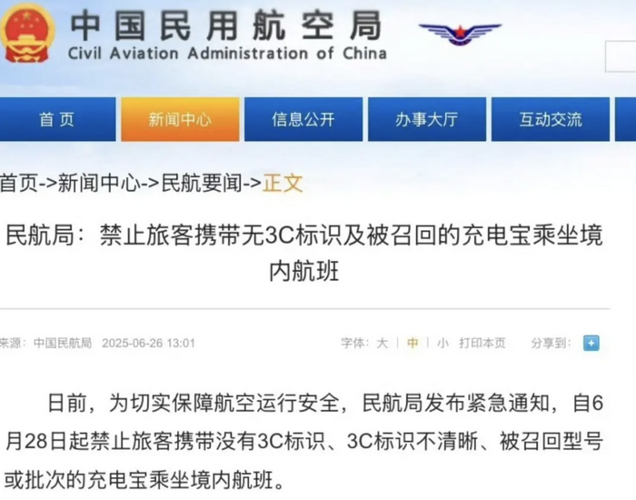 6月26日,民航局发布紧急通知,自6月28日起禁止旅客携带没有3C标识、3C标识不清晰、被召回型号或批次的充电宝乘坐境内航班,各机场安检部门要加强对旅客随身携带充电宝查验。