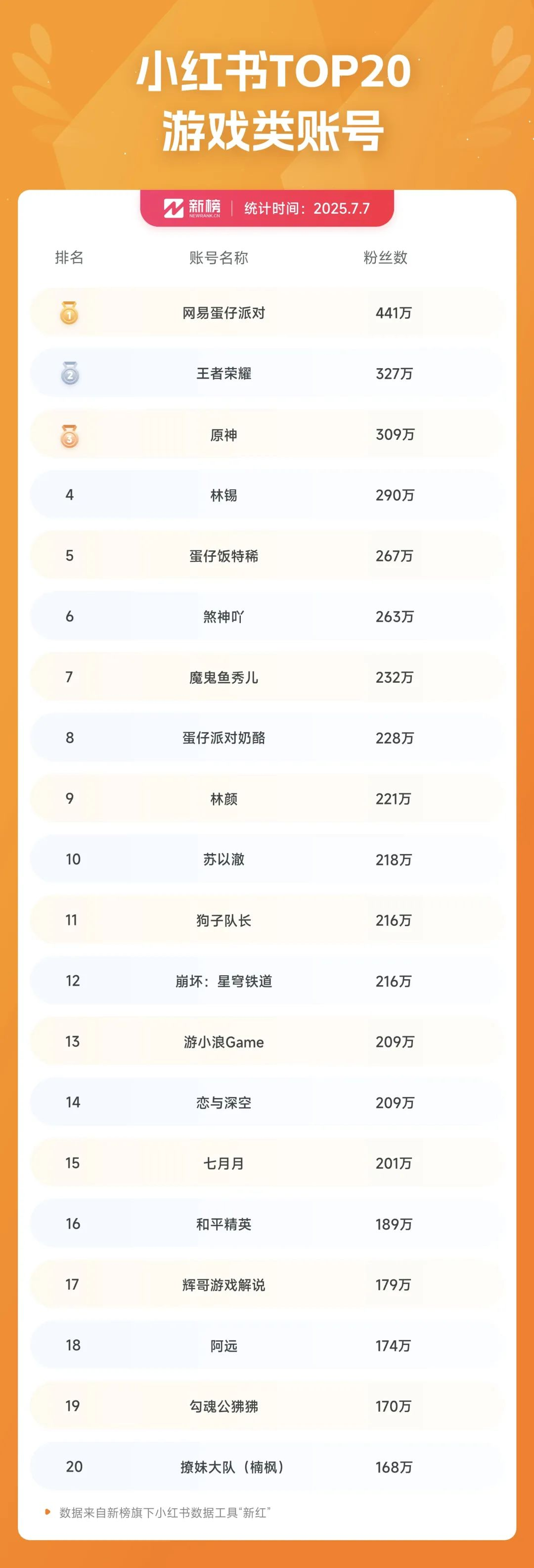 据新榜旗下小红书数据工具新红,今年上半年小红书涨粉TOP20账号中,仅“网易游戏”一个账号入围,而去年上半年至少有5个游戏类账号登榜。