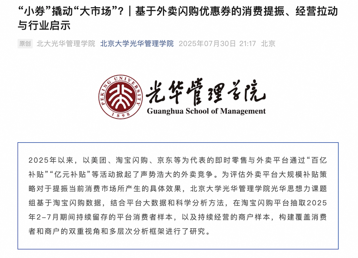 7月30日,北大光华管理学院微信公众号发布报告称,闪购优惠券的消费拉动作用存在显著的溢出效应,每1元的有效闪购补贴带动了消费者6.76元的额外消费;研究还发现,闪购渗透率与地区行业层面餐饮商家平均线下周营收正相关,未发现挤占堂食的统计证据;闪购优惠券对参与商户在线上、线下营收都有正向拉动作用,且对营收规模最小的25%商户的拉动作用最强。