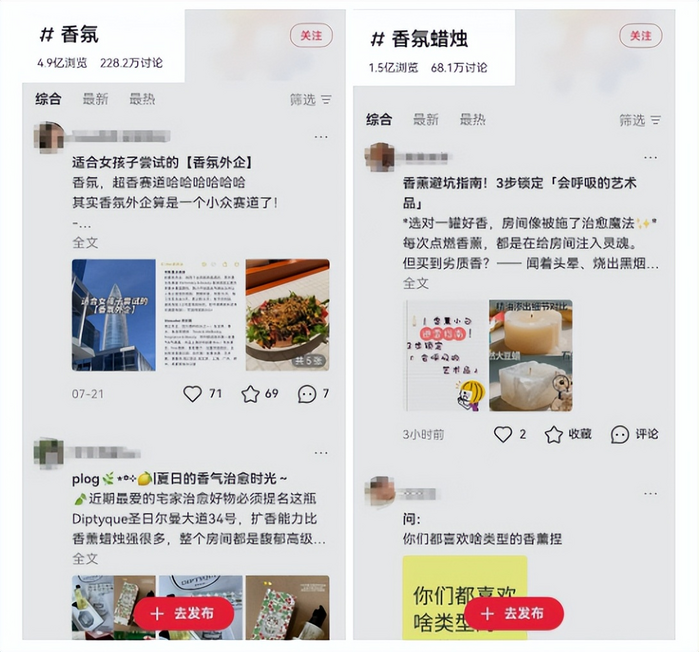 据观察,在小红书上,香氛话题已达4.9亿浏览,228.2万讨论;香氛蜡烛达1.5亿浏览,68.1万讨论;香氛喷雾达8578.2万浏览,42.2万讨论;家居香氛达4934.4万浏览,39.8万讨论。