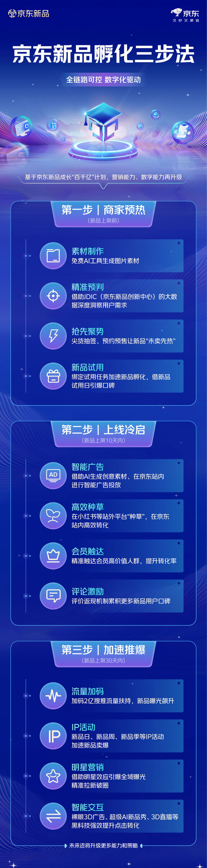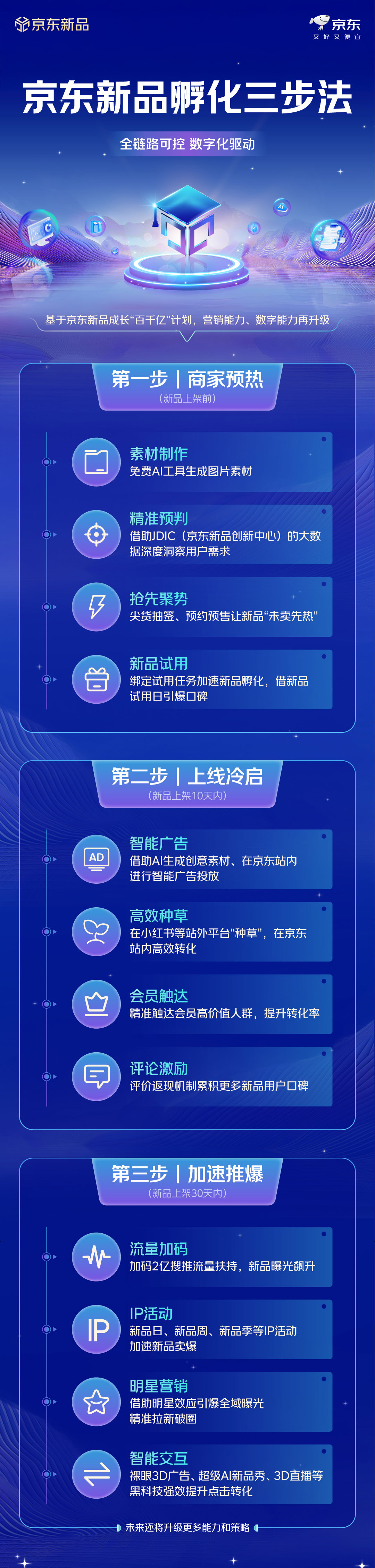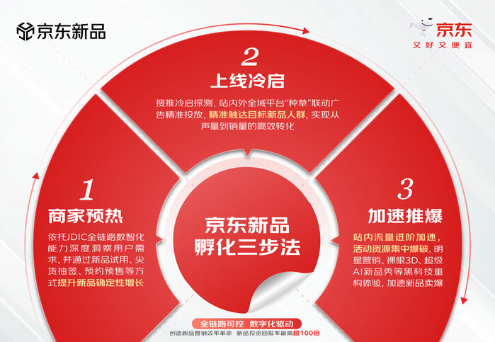 为了更好地实现这一目标,京东在新品成长“百千亿”计划的基础上,从新品上架到续销的过程中,整理出超100个运营动作,经过归段和归因后,提炼出了由商家预热、上线冷启、加速推爆这三步组成的京东“新品孵化三步法”。