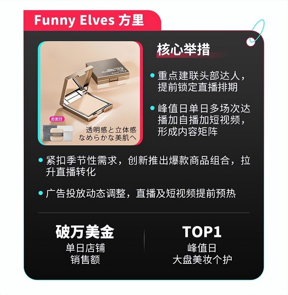 1.品牌营销和渠道建设:TikTok Shop内容场优势突出,达播加自播内容矩阵助力品牌如Funny Elves在日登顶美妆TOP1,Umay在法GMV暴涨244%。
