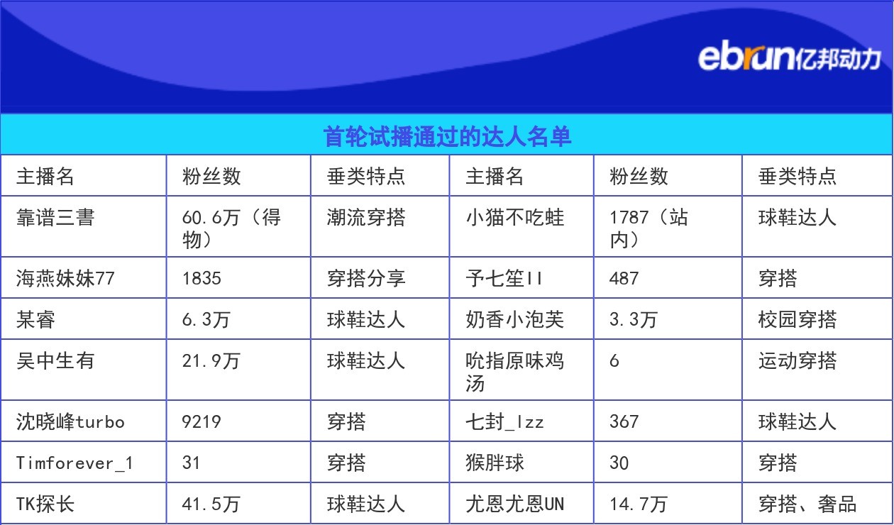 4.Q3试播进展:第一轮20人报名14人通过,第二轮结束名单未出,以站内球鞋穿搭类达人为主,粉丝量跨度大。