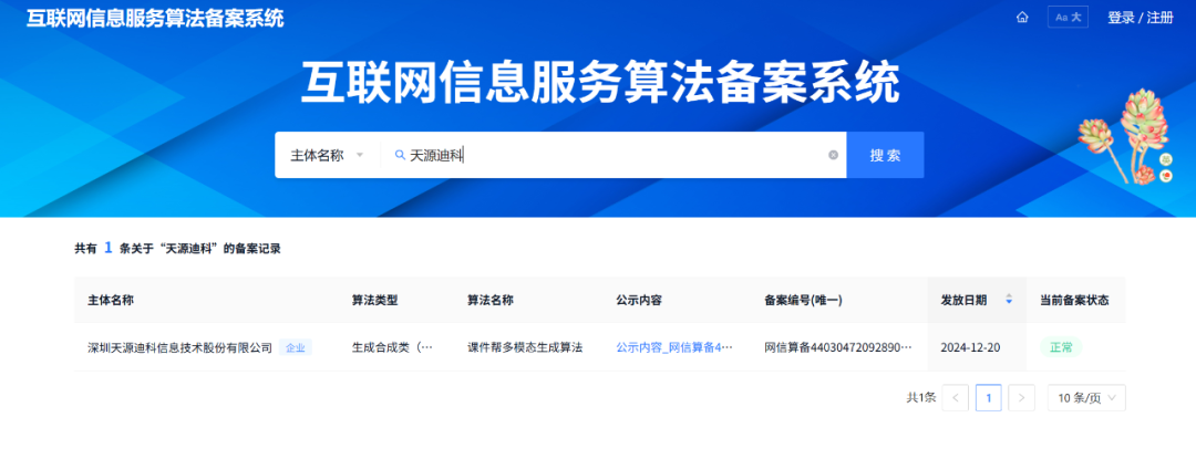 近日,天源迪科在人工智能领域再获重要突破!“天源迪科天枢大模型”成功通过网信办“生成式人工智能服务备案”。此前,“天源迪科课件帮多模态生成算法”也已完成“互联网信息服务算法备案”。
