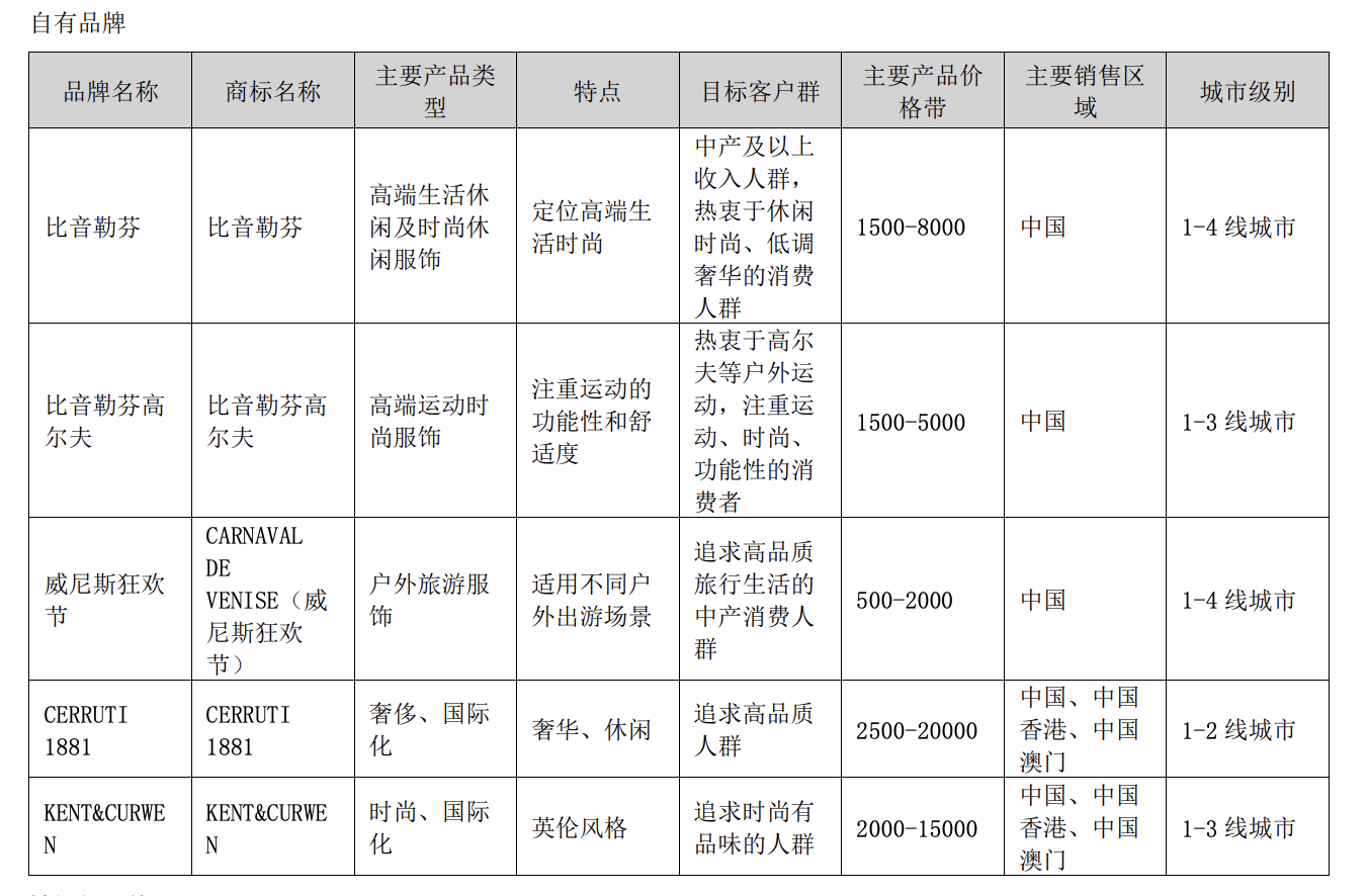 2.品牌组合包括自有品牌比音勒芬、比音勒芬高尔夫、Carnaval De Venise,以及收购的KENT&CURWEN和CERRUTI 1881,覆盖高尔夫、户外及奢侈品市场。