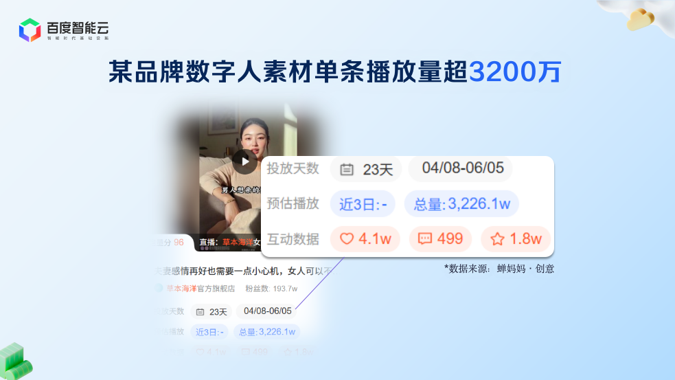 各位现场的领导、企业家以及在AI领域钻研的各位专家们,大家上午好,我是海妮。非常感谢百度智能云邀约我们蝉妈妈来到现场分享,今天我分享的主题是数字人素材破千万的实战方法论。