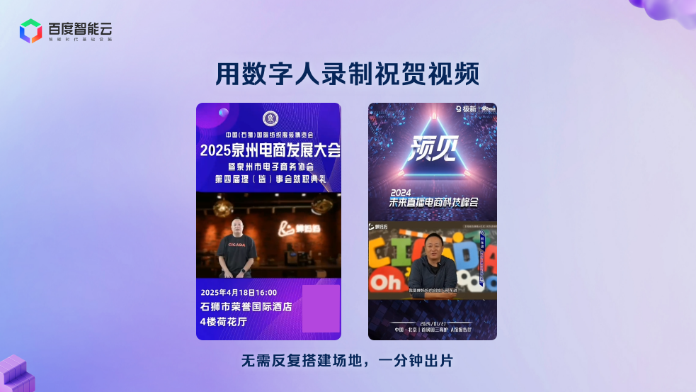 这是我们的数字人帮大型展会去做导览视频的一个素材,以及我们这次云智大会做的一个视频。各位老板在平时工作的过程当中,会不会遇到一个场景?就是你的合作伙伴或者是品牌方来求你说:兄弟,姐妹,我最近有一个活动,你来帮我录个祝福视频呗。