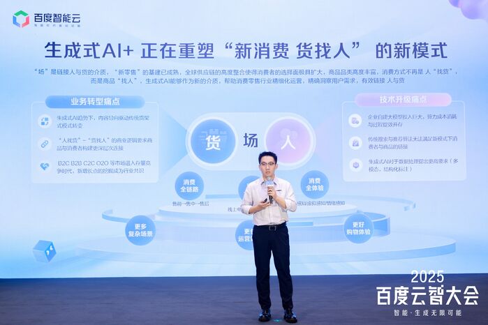 【亿邦原创】在数智化浪潮席卷全球的背景下,人工智能正以前所未有的深度与广度重构消费零售行业的底层逻辑与运行范式。2025百度云智大会AI+大消费专场上,百度智能云电商与消费零售解决方案专家赵治宇以《数智引领:大模型驱动下的消费场景变革》为题,系统阐述了生成式AI如何从“人、货、场”三大维度推动行业实现智能化跃迁。