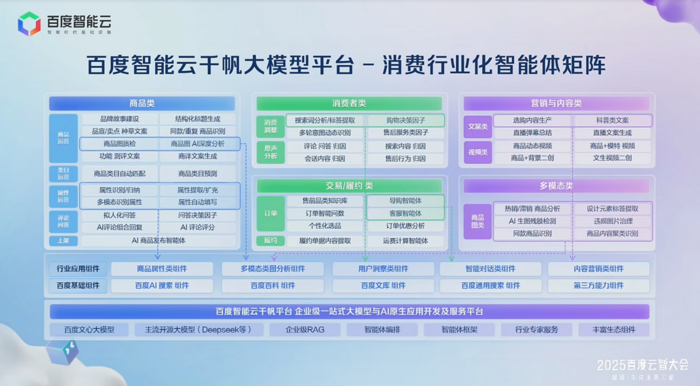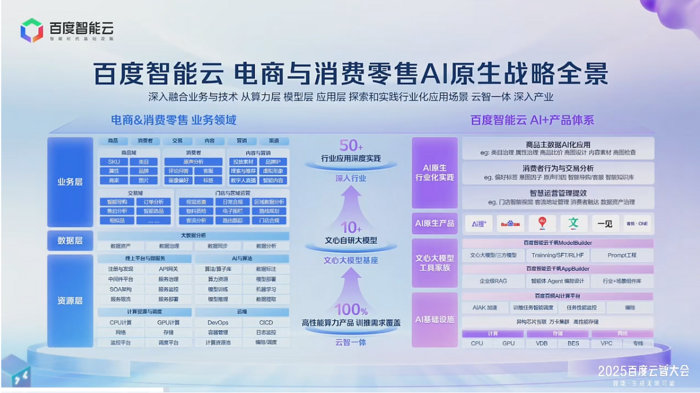 百度智能云在零售和消费行业有全栈式产品体系。大家看右边,我们在算力层、模型层、工具链层、产品层以及应用场景上,都有丰富的产品矩阵。