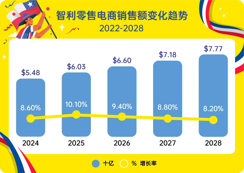 根据eMarketer预测,智利的零售电商销售额增速将在2025年达峰值,未来5年复合增长率达 9.1%,既昭示着南美“数字绿洲”的持续扩张,也暗含增速换挡期的精细化运营挑战。