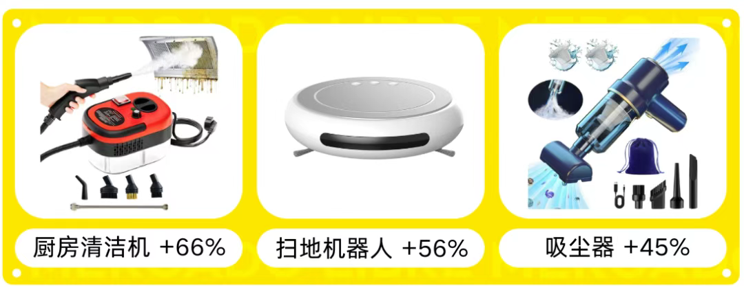 房屋&清洁品类在健康意识升级与居住空间精致化趋势下快速增长:扫地机器人因公寓小型化加速渗透,吸尘器、厨房清洁机借“深度消杀”功能抢占中产家庭。