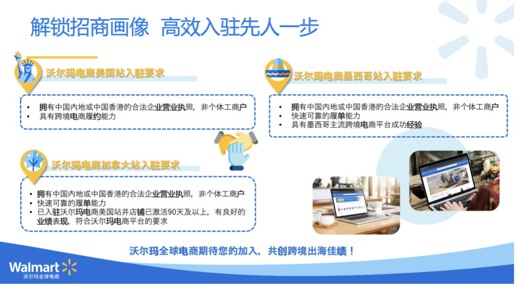 目前沃尔玛电商开放了美国、加拿大和墨西哥站点。李瑶介绍,“申请入驻需要有中国内地的公司或者中国香港的公司,目前我们是不接受个体工商户的。如果您想要进入加拿大站,美国站点的店铺要开90天,业绩还不错就可以开设加拿大站了。如果想进入墨西哥站点最好有跨境电商的成功经验,或者有墨西哥相关的账号”。