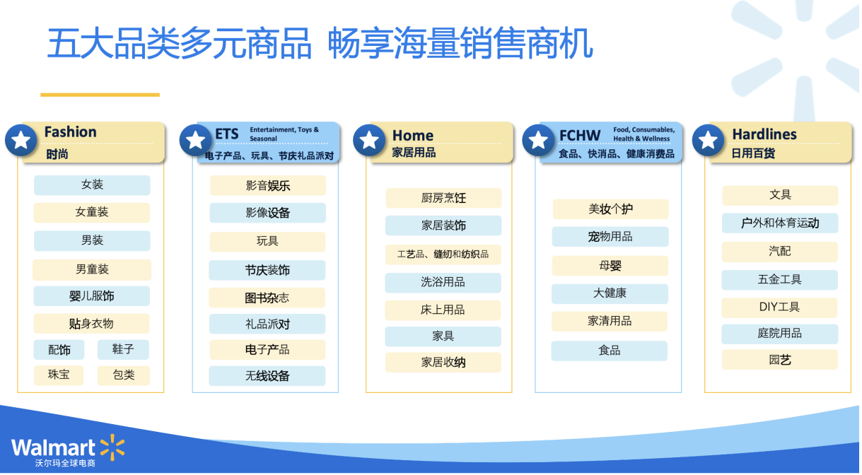 这是我们的一个案例,我们线下汽配维护门店有2600多家,目前沃尔玛电商有三个商家因为做线上平台做得非常好,有机会进入了我们的线下汽品维护中心,走入线下的美国市场。目前沃尔玛在五大品类上全部开放招商,可以说您卖什么,我们现在就在招什么。