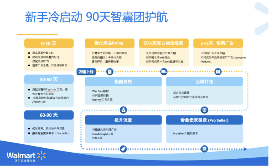 这里是从0到90天,我们的卖家在不同阶段需要做些什么,我们前期要完成基本的广告、物流,后面我们会做清单优化,品牌优化,再到流量的提升,我们都会有一系列的动作为大家提供支持。