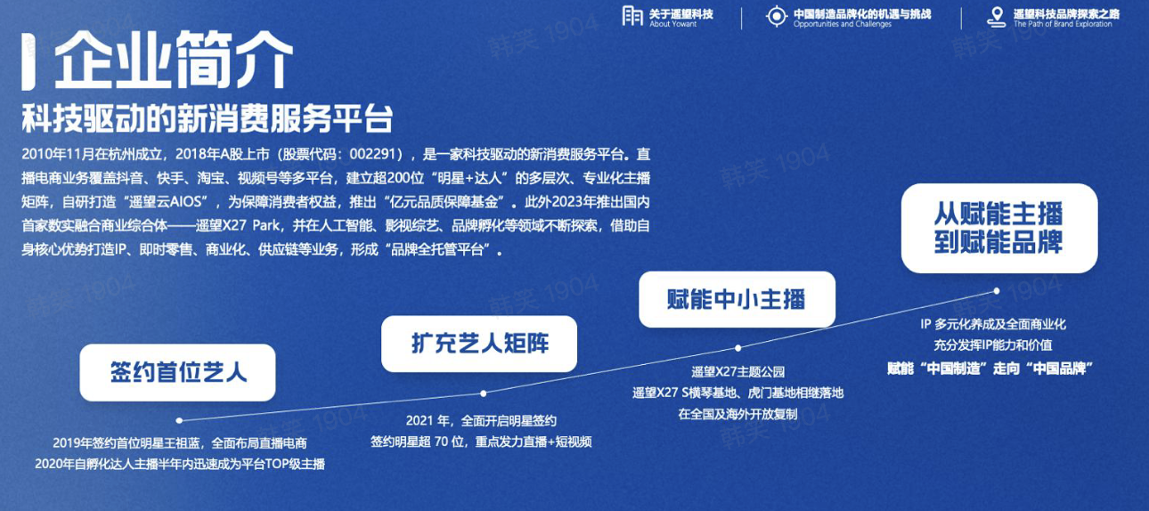 在2023年年底,我们开启了第一个直播加线下一起的商业综合体叫遥望X27,在24年陆续开了横琴跟虎门的基地。到了今年上半年,我们从做单一的明星主播带货到做艺人的矩阵。从前年开始,我们也去把能力赋能给中小主播。
