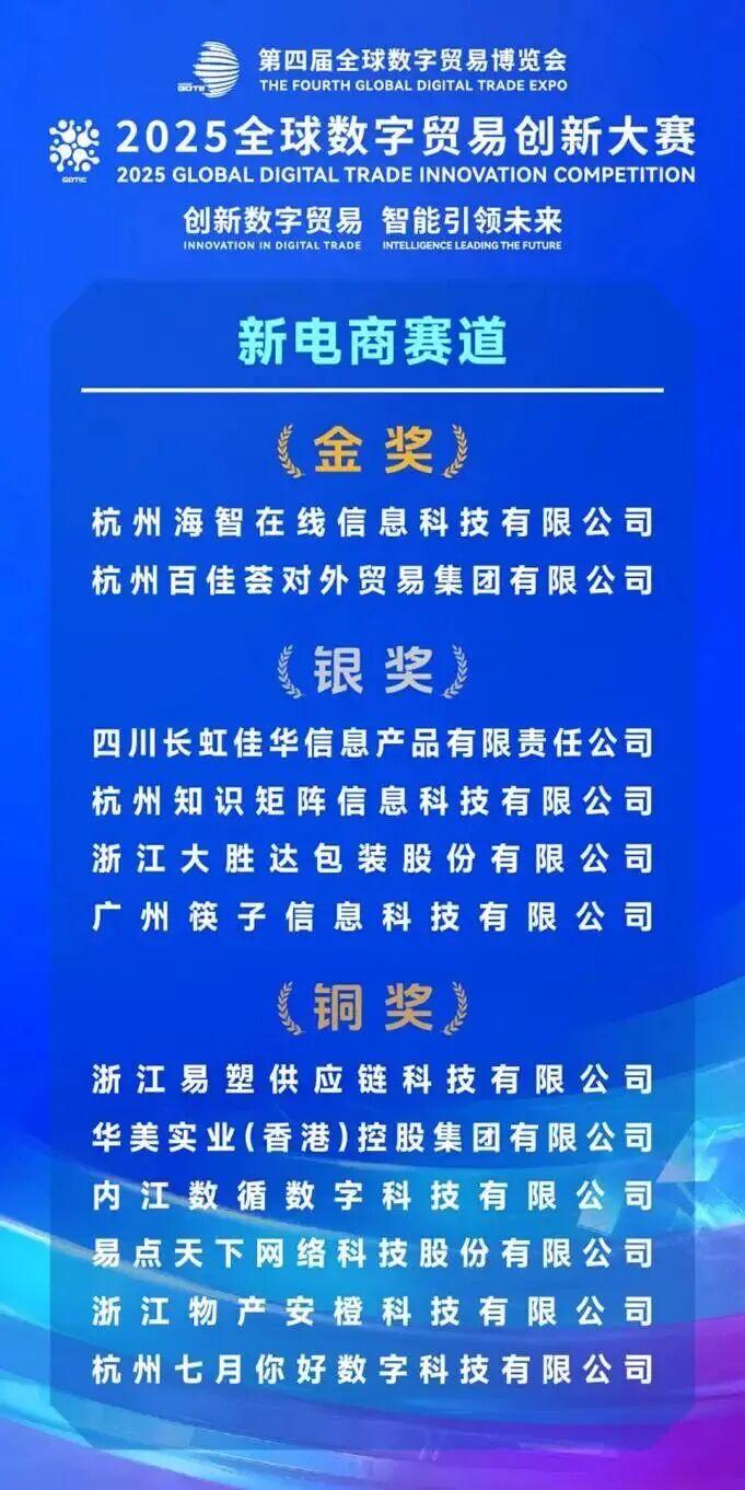 9月25—28日,2025全球数字贸易创新大赛(以下简称“数贸大赛”)决赛在杭州举行。其中,新电商赛道决赛于27日举行。经过激烈的角逐,杭州百佳荟集团凭借其卓越的创新能力和领先的数字贸易解决方案,从众多参赛企业中脱颖而出,荣获大赛最高奖项——金奖!