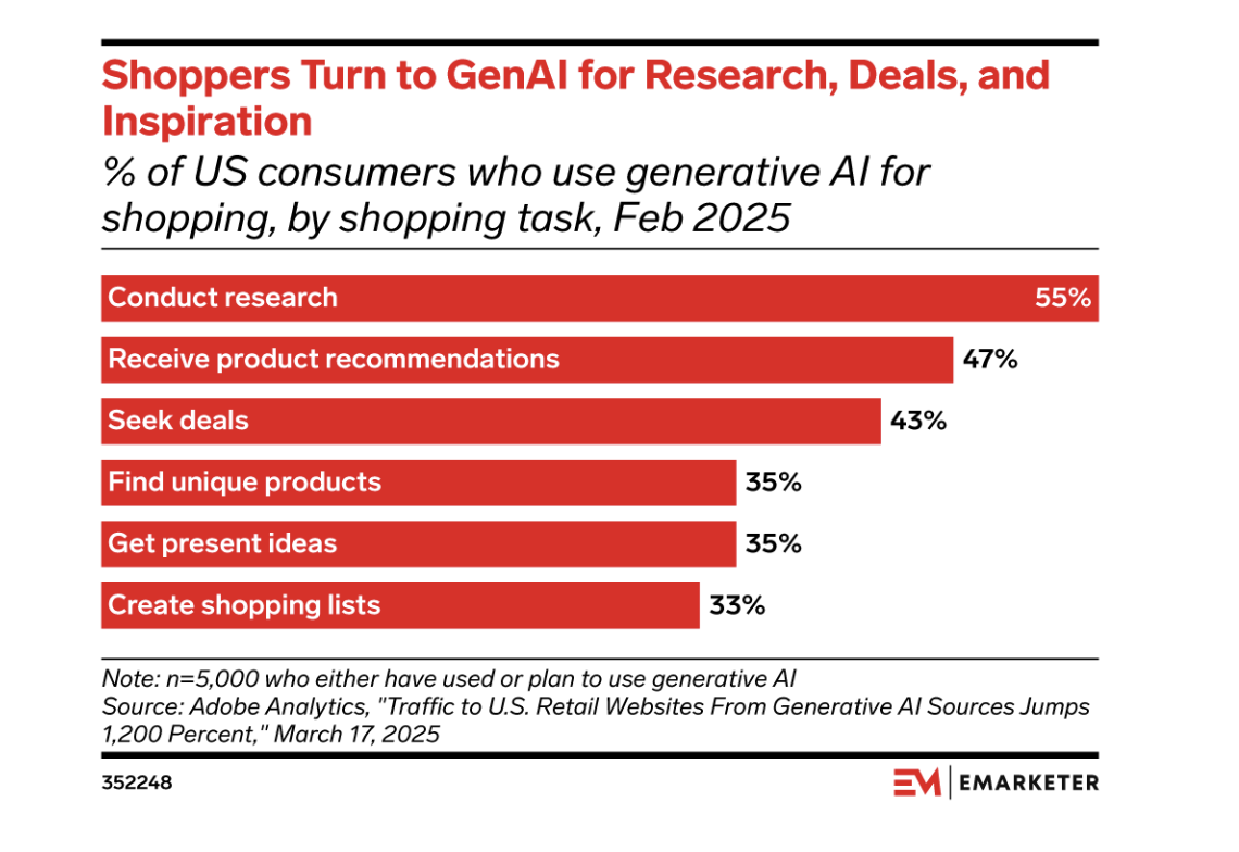 毋庸置疑的是,这是一种主流的货架电商和内容电商之外的新形式,且已经有相当规模的用户基础。市场研究机构eMarketer预测,ChatGPT今年将拥有7710万美国用户,占GenAI用户的近66%;Adobe数据显示,53%的消费者计划今年通过GenAI购物,大多数消费者正在转向GenAI进行产品研究 (55%) 和推荐 (47%)。
