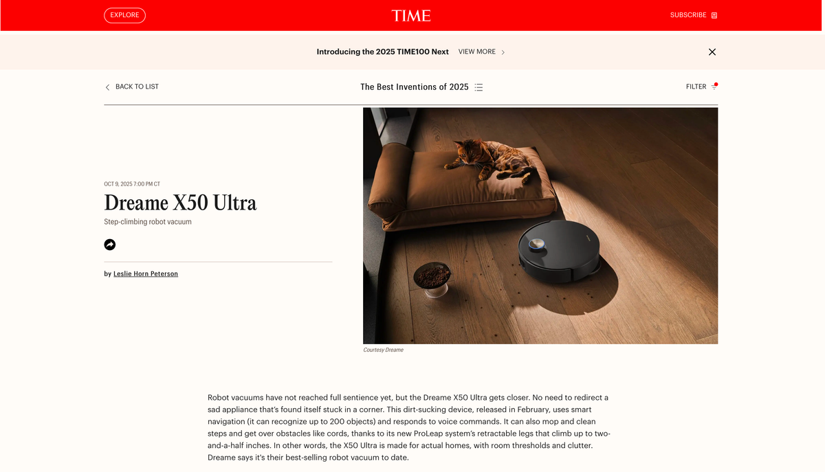 10月9日,美国《时代周刊》(Time)公布2025年“Best Inventions of the Year”(年度最佳发明榜单),揭晓了备受关注的年度最佳产品。追觅扫地机X50 Ultra凭借突破性的仿生机械足技术和卓越的创新实力入选,成为此次唯一上榜的扫地机产品。