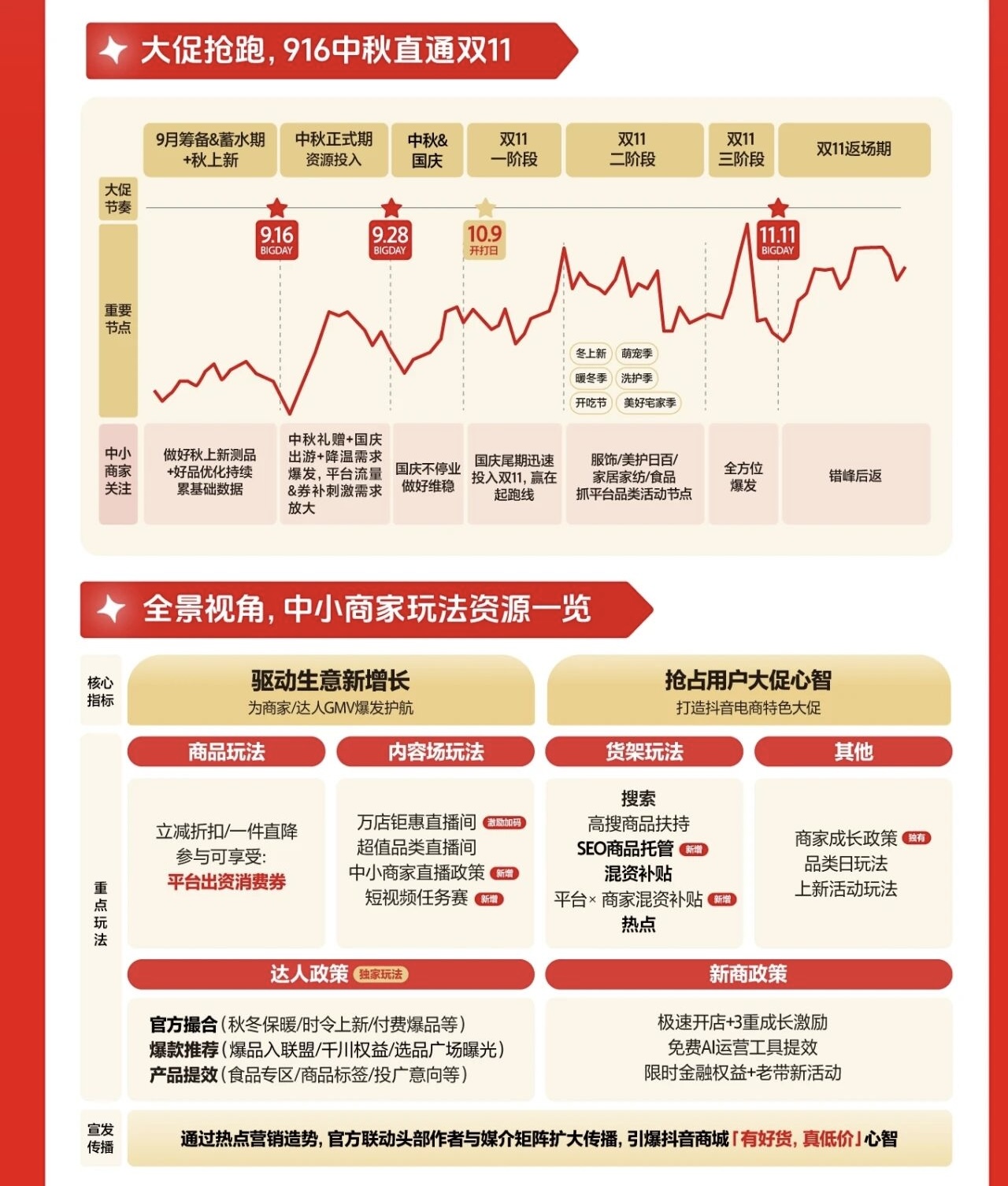 据悉,本次抖音双11大促分为中秋期、正式期和返场期三阶段。其中正式期由10月9日开始,先是开门红,中间爆发期会结合“冬上新”、“萌宠季”、“暖冬季”、“洗护季”、“开吃节”、“美好宅家季”等不同行业开展品类日活动,后续会有Big Day集中冲刺。