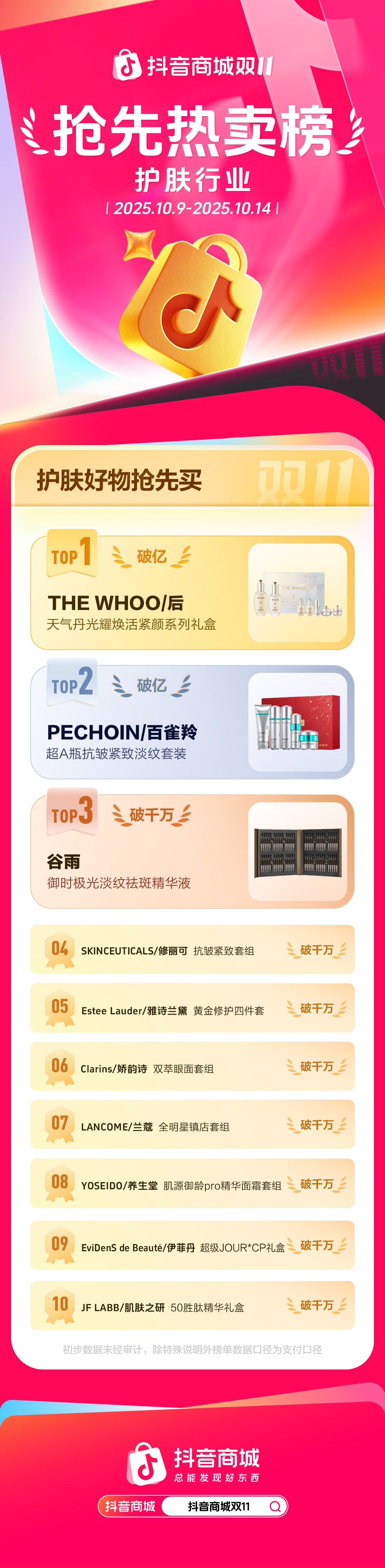 根据官方战报,10月9日至10月14日,累计销售额破亿元的单品有4个,分别是北面三合一羽绒服、天气丹光耀焕活紧颜系列礼盒、百雀羚超A瓶抗皱紧致淡纹套装、大疆Pocket3。