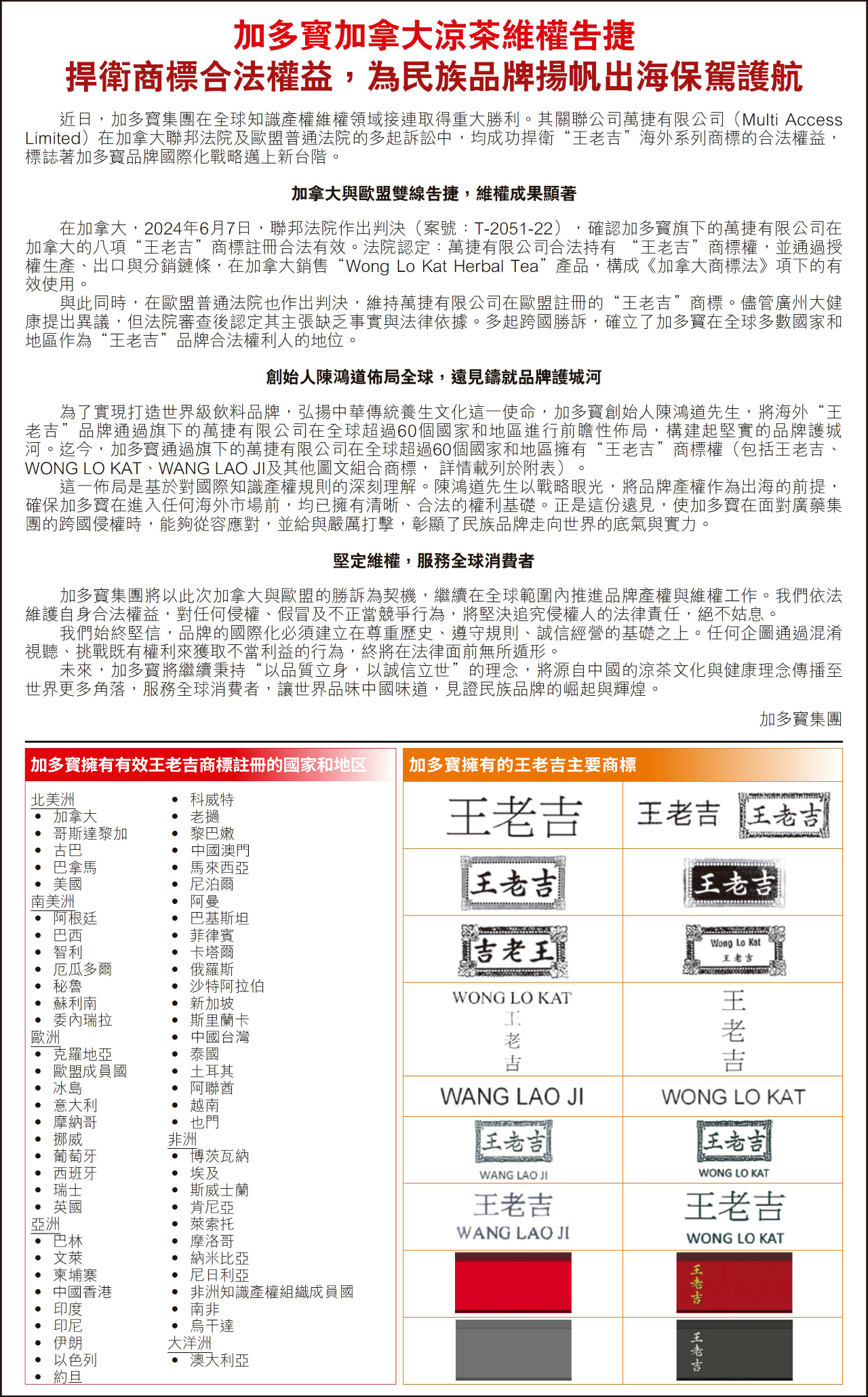 10月10日,加多宝再次发布了《加多宝集团关于海外“王老吉”商标所有权的声明》,其中提到“加多宝集团于2000年代初合法获得海外王老吉商标所有权,已在全国超过60个主要国家和地区注册王老吉商标,将继续坚定积极推进品牌维权和保证工作,依法捍卫加多宝集团拥有的海外王老吉品牌的知识产权”。