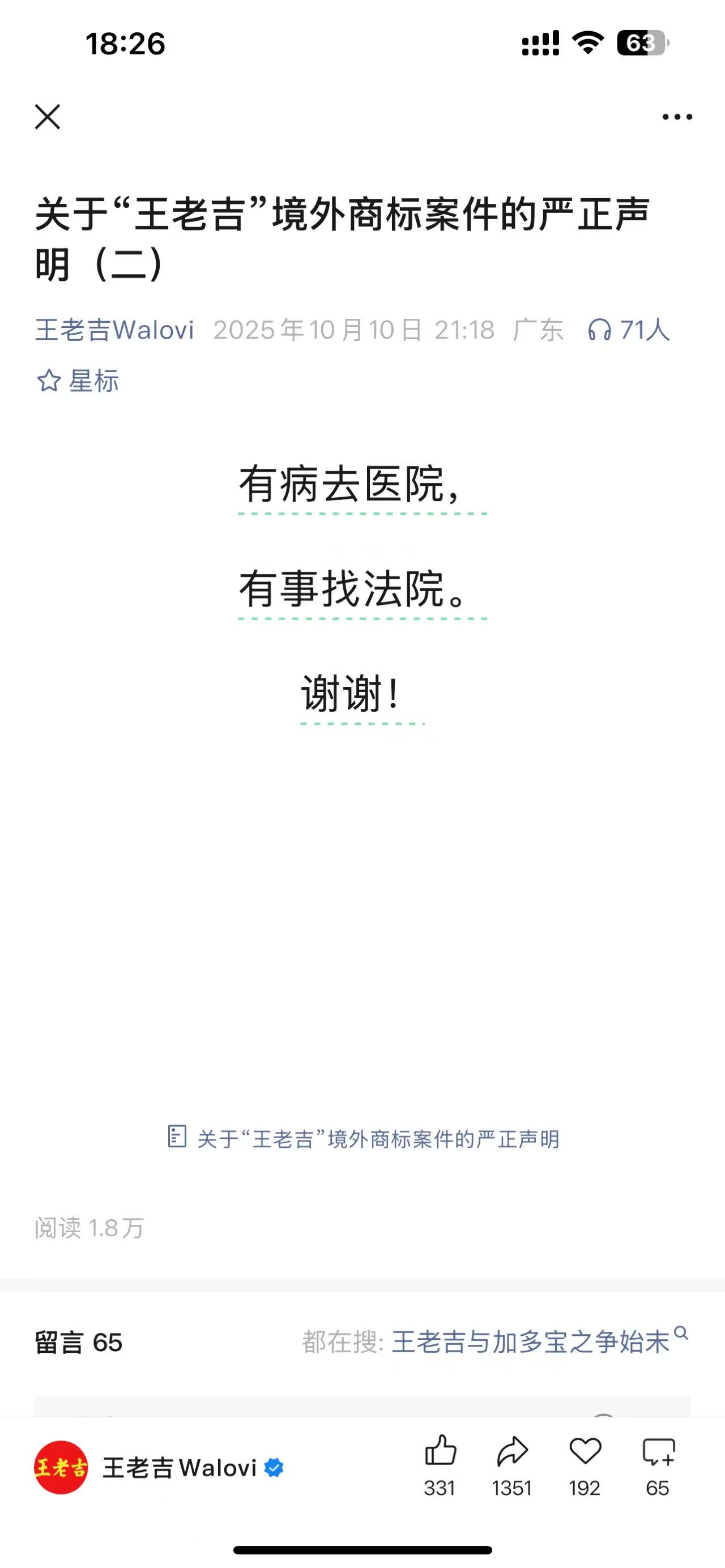 当晚王老吉发布了开篇提到的“发疯式”回应:“有病去医院,有事找法院。谢谢!”