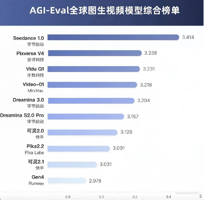 例如在AGI-Eval全球图生视频AI模型排名中,火山引擎的Seedance 1.0拿下冠军,Gen4跌至末位。