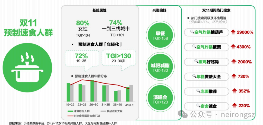1. 增长市场和消费变化:小红书生鲜品类GMV同比增长300%,平台进入内容电商红利期,一二线城市女性用户(占比74%)驱动需求,偏好冷冻速食和高品质生活。