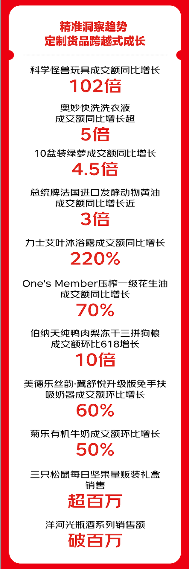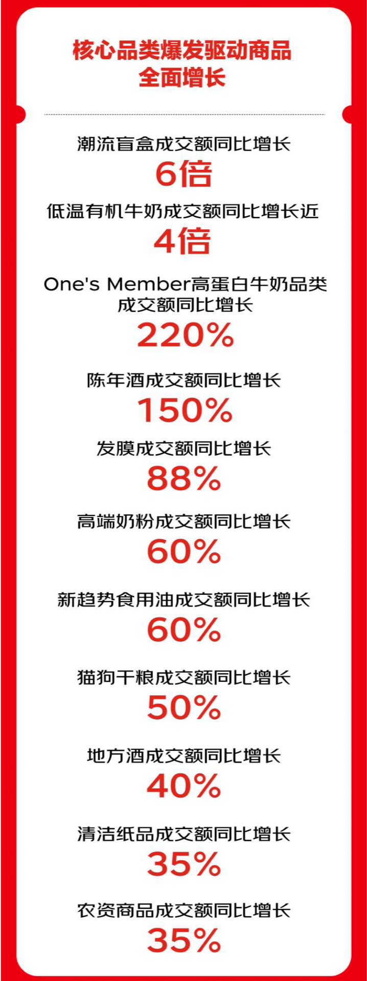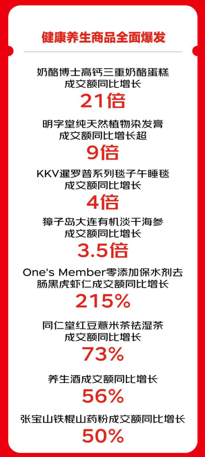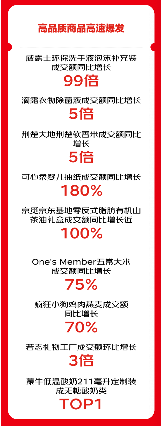 京东超市中的母婴、个护、家清、休食饮品、酒类、玩具等10余个核心品类实现爆发式增长,其中,潮流盲盒成交额同比增长6倍;低温有机牛奶成交额同比增长近4倍;发膜成交额同比增长88%;猫狗干粮成交额同比增长50%;清洁纸品成交额同比增长35%。