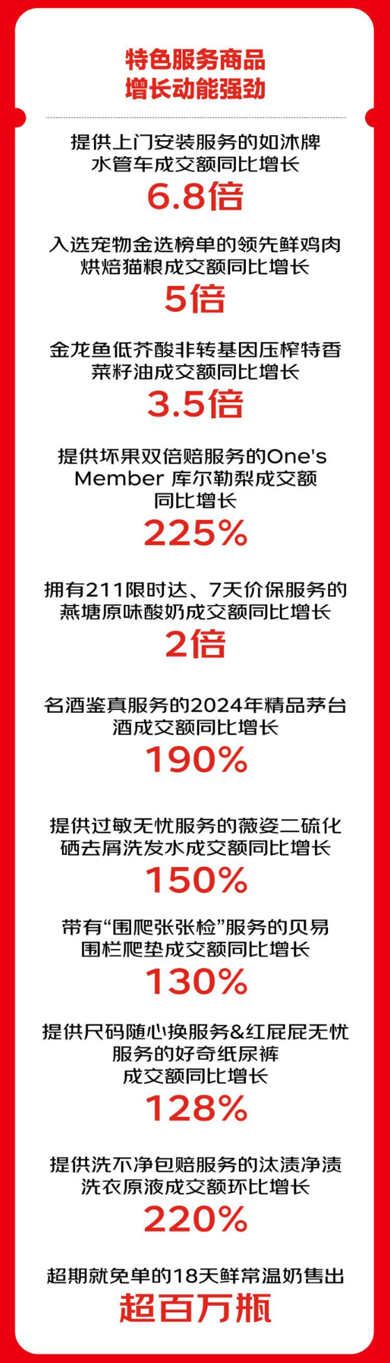 3. 特色服务促进销售:提供上门安装的如沐牌水管车增长6.8倍,红屁屁无忧服务的纸尿裤增长128%,坏果双倍赔服务提升信任。