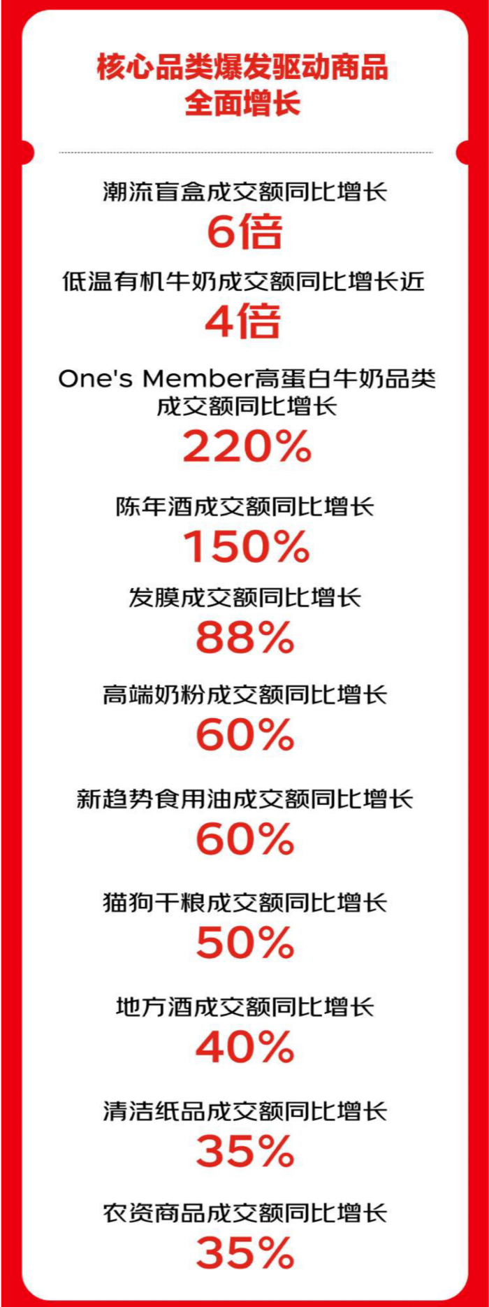 2. 核心品类增长显著:潮流盲盒成交额增长6倍,低温有机牛奶近4倍增长,发膜增长88%,突出兴趣与健康消费趋势。