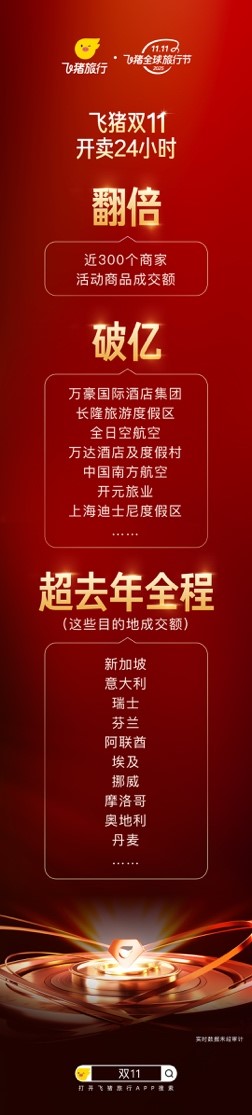 1.关键数据:开卖24小时,近300个商家活动商品成交额较去年翻倍,出境游表现突出,如新加坡、意大利、瑞士等目的地成交额超过去年全程。
