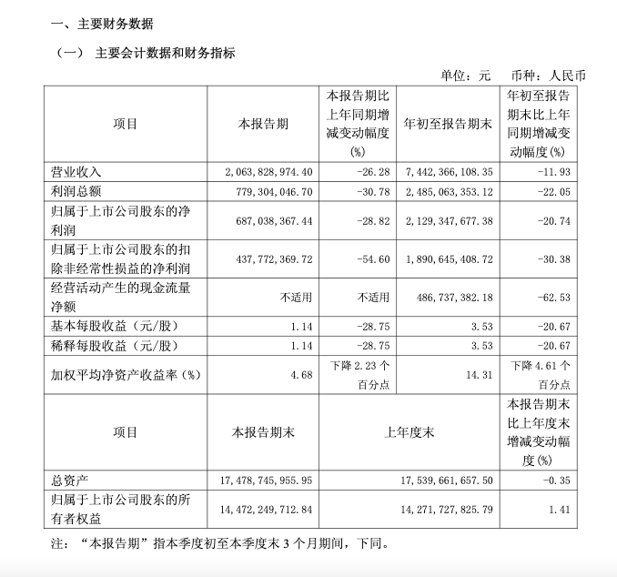 财报显示,公司前三季度营业收入74.42亿元,同比下降11.93%;归属于上市公司股东的净利润21.29亿元,同比下滑20.74%,扣非净利润降幅达30.38%,这是其自2006年以来首次出现营收、净利润“双降”的局面。