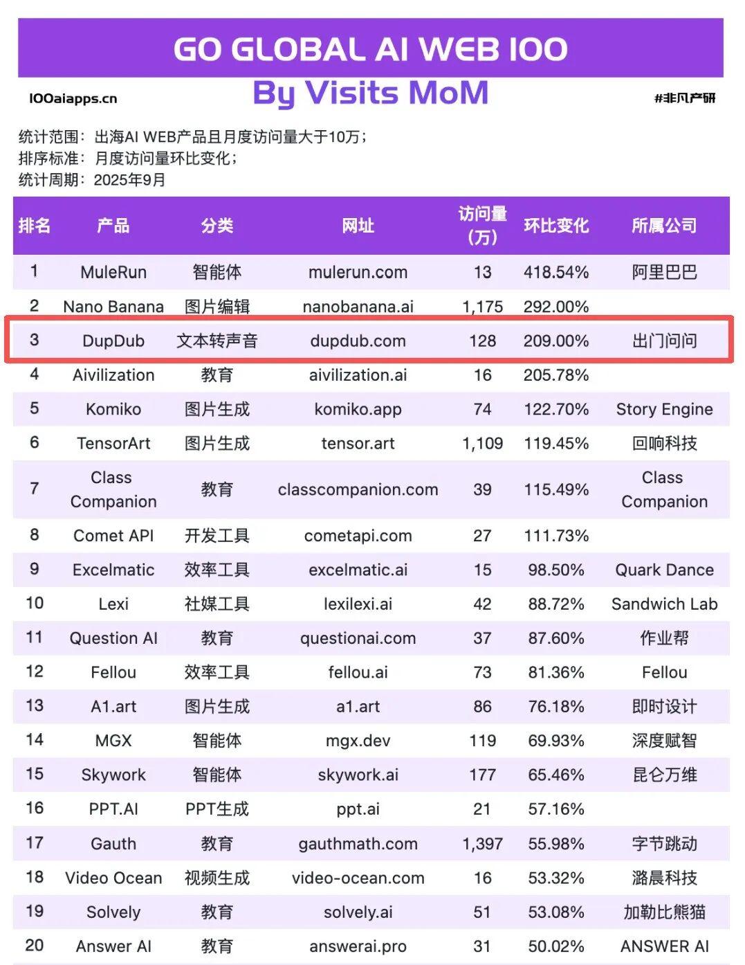 海外版AI配音助理「DupDub」访问量达128万,环比增长209%,位居月度访问量前三强,证明其在全球市场的高需求。