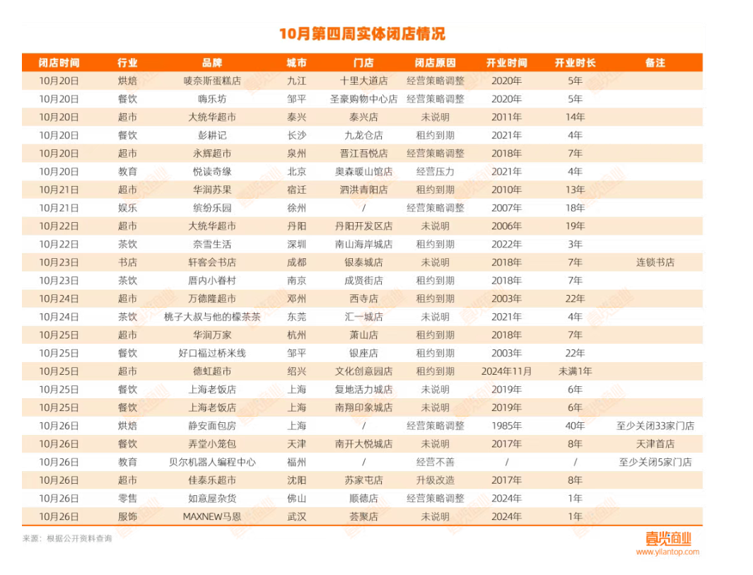 10月第四周共有23个品牌关闭了61家门店,市场处于动态优化与洗牌之中,主要涉及超市、餐饮、烘焙等行业的核心调整信息。