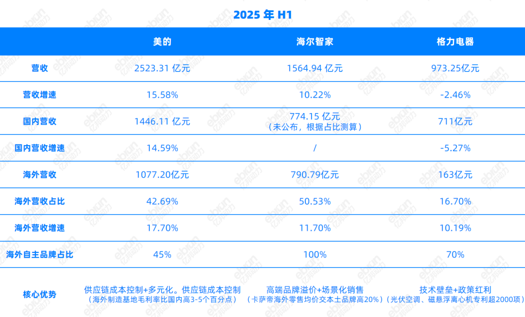 2025年上半年,美的集团营收2523.31亿元,同比增长15.58%;海尔智家营收规模突破1500亿元关口,同比增长10.22%;格力电器营收973.25亿元,同比下滑2.46%。美的全面领跑,海尔高端突围,格力则面临承压转型。