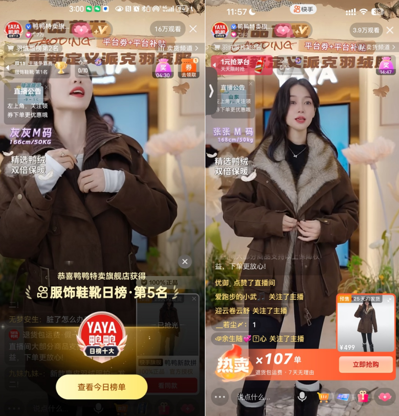 2. 商业机会:寒潮引爆羽绒服消费,平台专属货盘(引流款、主推款)提供规模化生产契机;快手乘风计划资源倾斜促成大促爆发。