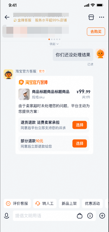 3.“淘宝官方保障”服务正式推出,当商家超时未处理时触发淘宝客服介入,提供多种解决方案,确保正当权益得到保障。